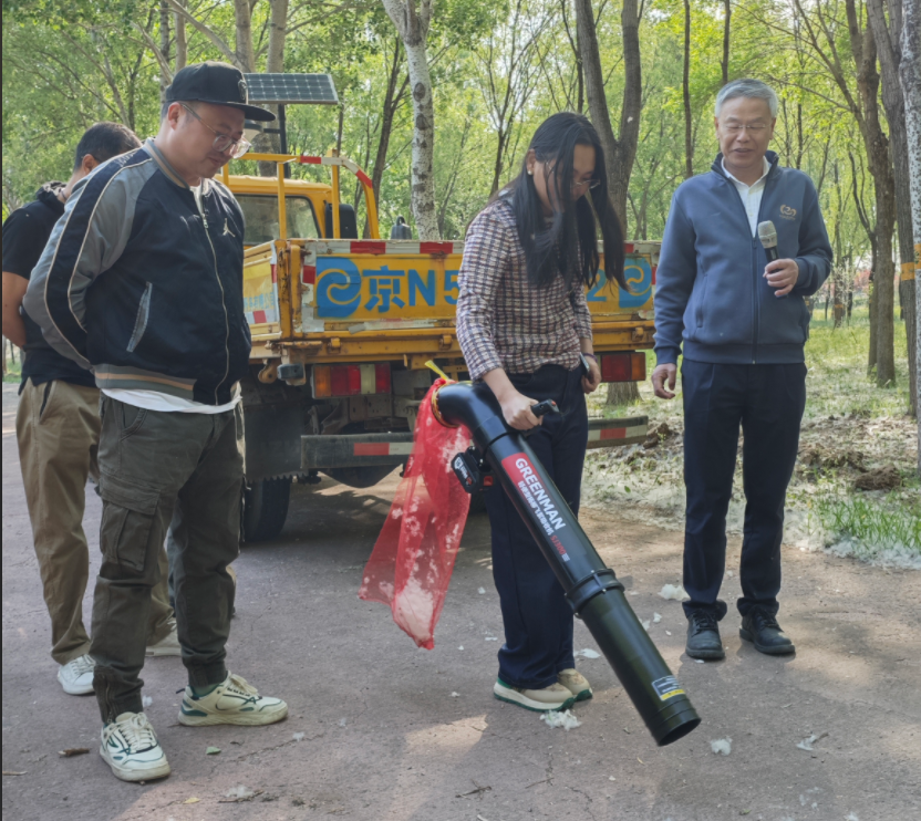2025年4月29日,北京市園林綠化局在通州區(qū)舉行楊柳飛絮防治現(xiàn)場會。會上,北京市園林綠化局二級巡視員王小平介紹了北京市楊柳飛絮防治方案及取得的階段性成果,特別是對綠友集團依托北京市科委項目完成的兩款防治產(chǎn)品-電動樹干打孔注藥機ZYJ15D和輕便型楊柳飛絮吸絮機SJ300D在飛絮防治中的作用表示高度認可。綠友集團總裁李敏現(xiàn)場介紹了兩款產(chǎn)品的研發(fā)情況、工作原理及產(chǎn)品特點,并由工作人員現(xiàn)場進行了實際操作演示,得到了參會領(lǐng)導、同行及使用單位的一致認可?,F(xiàn)場會同時進行了首批輕便型楊柳飛絮吸絮機SJ300D的集中發(fā)放儀式,來自包括中央黨校園林處、北海公園、頤和園、通州區(qū)園林綠化局、通州區(qū)城管委、國家植物園、北京安貞醫(yī)院、經(jīng)開區(qū)生態(tài)環(huán)境管理局、西城環(huán)衛(wèi)等在內(nèi)的近20家單位現(xiàn)場領(lǐng)取了綠友集團研發(fā)生產(chǎn)的SJ300D型輕便型楊柳飛絮吸絮機,期待綠友吸絮機能夠在楊柳飛絮防治工作中起到重要作用。